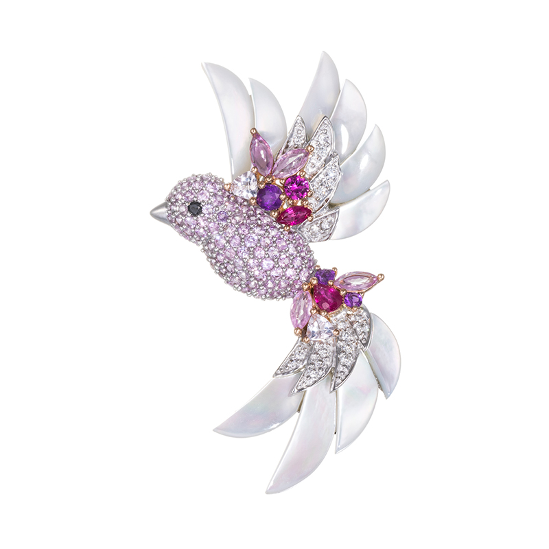 K18WG/PG マルチカラーストーン ダイヤ 白蝶貝 ファンタジーバード ペンダントブローチ PS 約1.60ct RB 約0.25ct D 約0.15ct MOR 約0.15ct AM 約0.10ct BLD 約0.01ct