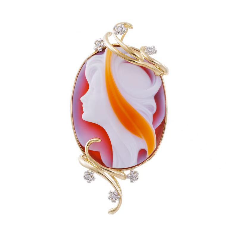 K18YG/PT900 メノウカメオ ダイヤ ペンダントブローチ カメオ 約35×27mm D 約0.06ct