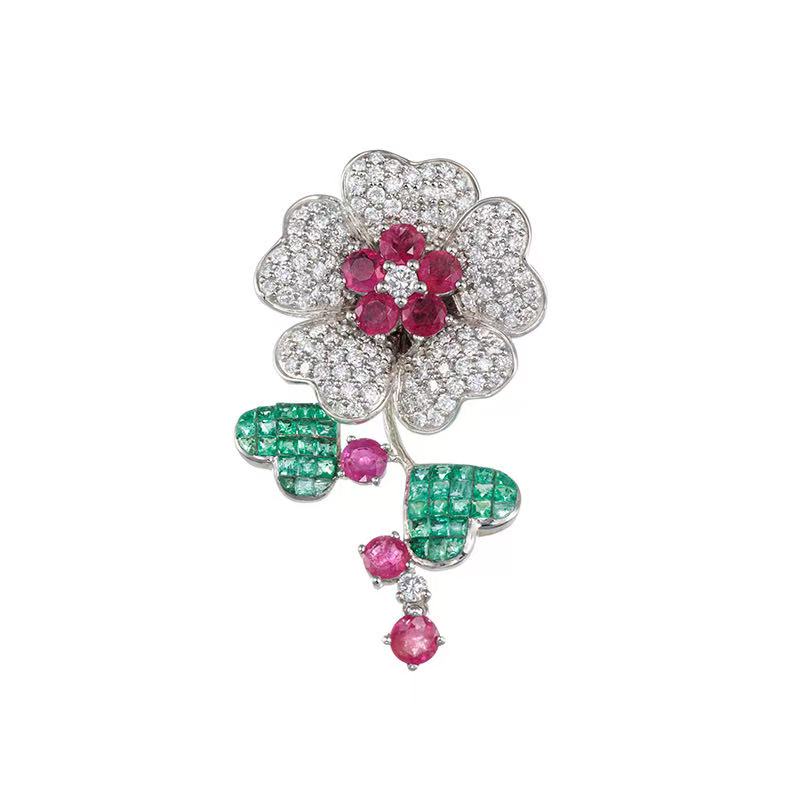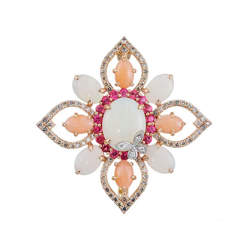 K18PG/PT950 ホワイトオパール モモサンゴ タンザニア産レッドスピネル ブラウンダイヤ & ダイヤ Elena ブローチ OP 約3.40ct COR 約1.20ct SP 約0.60ct BRD 約0.55ct D 約0.02ct