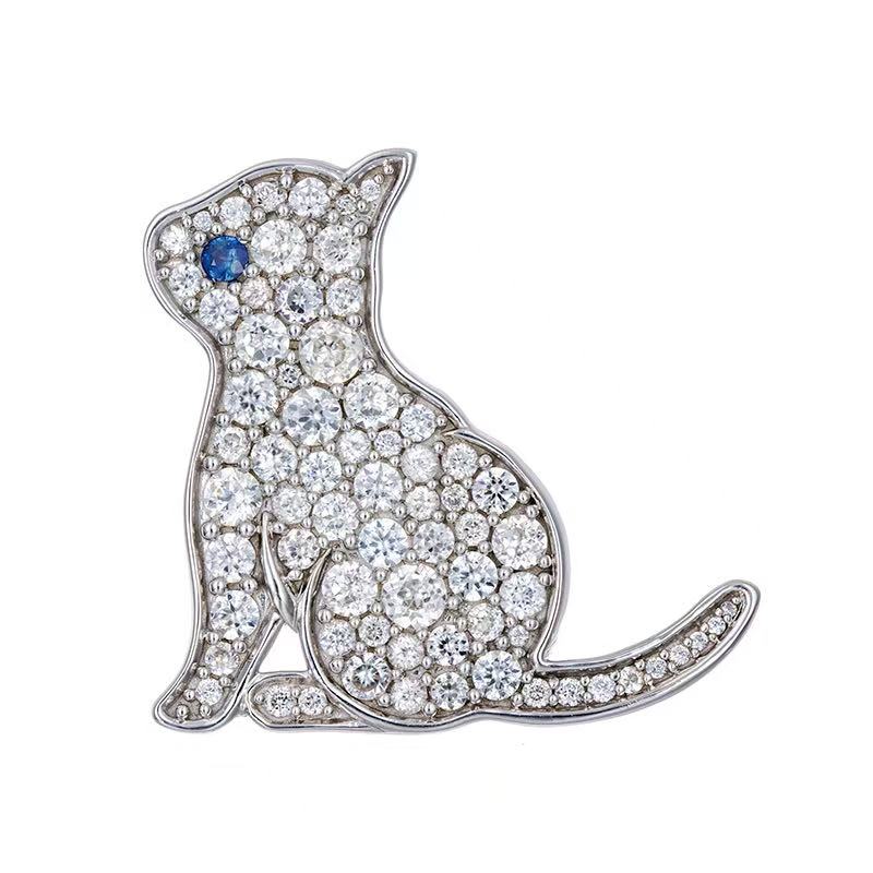 パラジウムシルバー950 サファイア 天然ホワイトジルコン 子ネコ ブローチ SA 約0.05ct ZI 約4.45ct